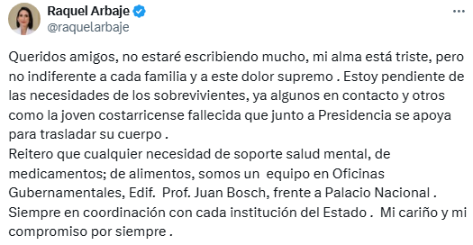 La primera dama Raquel Arbaje, compartió a través de su cuenta de X un emotivo mensaje que refleja su profunda tristeza tras el lamentable suceso del Jet Set. En un tuit que transmitió un tono de solidaridad y apoyo, Arbaje expresó su dolor, asegurando que está comprometida en brindar ayuda a las víctimas y a sus familias en este difícil momento.