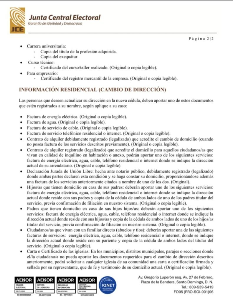 - Carta o Certificado de las iglesias: En los municipios, distritos municipales, parajes o secciones donde el/la ciudadano/a no pueda aportar los documentos requeridos para el cambio de dirección descritos anteriormente, podrá solicitar a cualquier iglesia de su comunidad una carta o certificación firmada y sellada por su representante, que de fe y testimonio de su domicilio actual. (Original o copia legible).