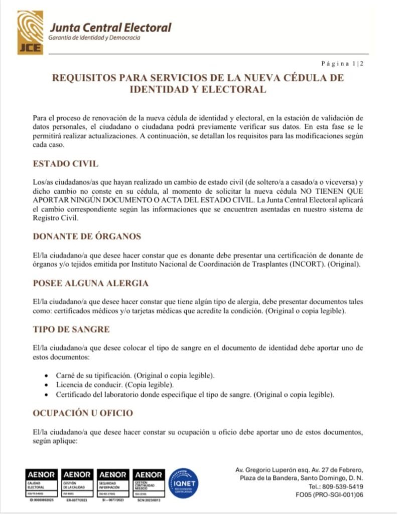 Los/as ciudadanos/as que hayan realizado un cambio de estado civil (de soltero/a a casado/a o viceversa) y dicho cambio no conste en su cédula, al momento de solicitar la nueva cédula NO TIENEN QUE APORTAR NINGÚN DOCUMENTO O ACTA DEL ESTADO CIVIL. La Junta Central Electoral aplicará el cambio correspondiente según las informaciones que se encuentren asentadas en nuestro sistema de Registro Civil.